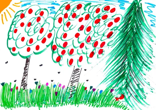 На рисунке изображен яблоневый сад в Царицыно. Раньше здесь жили в небольших домиках люди и выращивали яблоневые сады. Еще раньше здесь было дачное Царицыно. Со временем люди переехали в благоустроенные многоквартирные дома, а от прежних времен нам остались яблоневые сады.