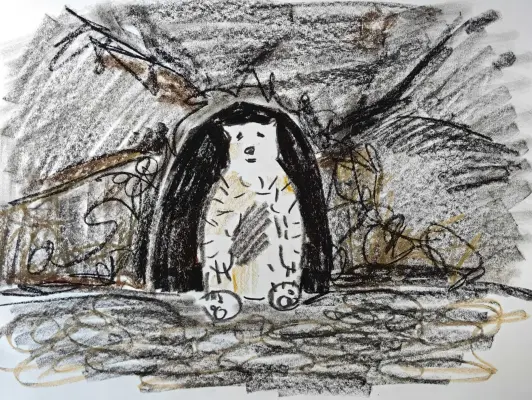 На полотне изображён арктический хищник, белый медведь. Он покидает своё зимнее убежище с наступлением утра.
