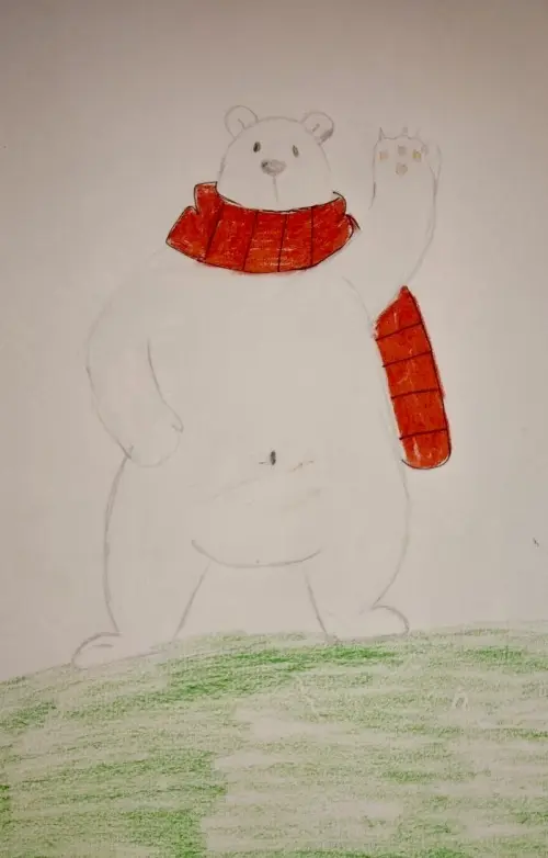 Медведи на Северном полюсе не мерзнут, однако мой немного замерз, поэтому я изобразил его с красным шарфом. Под его ногами находится трава, потому что я его перенес к нам, в Россию, где сейчас тепло. Он поднимает руку и здоровается с нами - людьми.