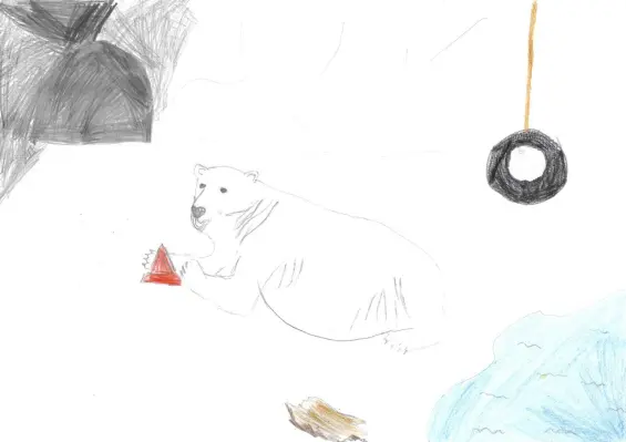 Я нарисовала белого медведя Терпея у себя в вольере в зоопарке. Медведь уже очень взрослый и переехал к нам из другого города, где был маленький вольер