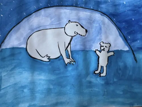 В Московском зоопарке есть белый медведь. Он добрый и заботливый, сильный и смелый. Я нарисовал как медведь учит медвежонка спать зимой , рассказывает ему сказки.