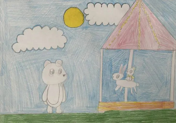 Я изобразила медведя Персея со своим медвежонком на московской ярмарке в Щукино. Малыш катается там на карусели, а папа на него любуется. Мы тоже с семьей любим там проводить время, летом там можно покататься на карусели, поиграть в теннис и посетить мастер-классы по рисованию