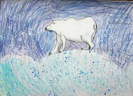 Я изобразила медведя Терпея идущему по снегу, ведь белые мишки так любят жить в холодном климате. Снег бывает пушистый или колючий, крупинками или паутинкой. С помощью карандашей и краски я постаралась показать разную текстуру снега. И моему мишке там тоже нравится!