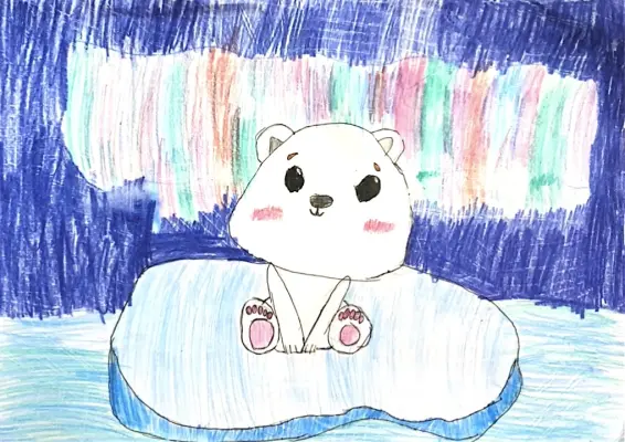 «Я нарисовала медвежонка, который отдыхает на льдине после своих совершенных подвигов в Арктике. Потом его привезут в зоопарк и он будет совершать свои подвиги уже для людей, показывая им невероятные трюки и вместе с ними веселясь» . Алиса 8 лет
