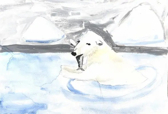 Мой рисунок - это медведь Терпей из Московского зоопарка. Мишку привезли сюда до моего рождения. Для нашего зоопарка мишка стал любимцем многих посетителей. Я изобразила медведя в естественной среде обитания, потому что в Москве сейчас очень жарко, а белый медведь любит холод и лёд. В пасти у медведя - большая рыба, это любимая еда белых медведей. У Терпея на рисунке опущены уши, потому что он только что вылез из холодной воды.