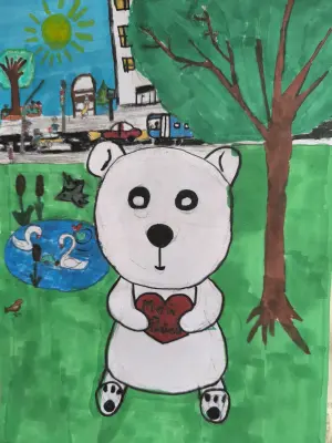 На моём рисунке изображен медведь Терпей у пруда в парке Яуза, вдоль Юрловского проезда, в районе Отрадное. Я очень люблю это место, часто здесь гуляю. Мне представился мишка именно в этом месте.