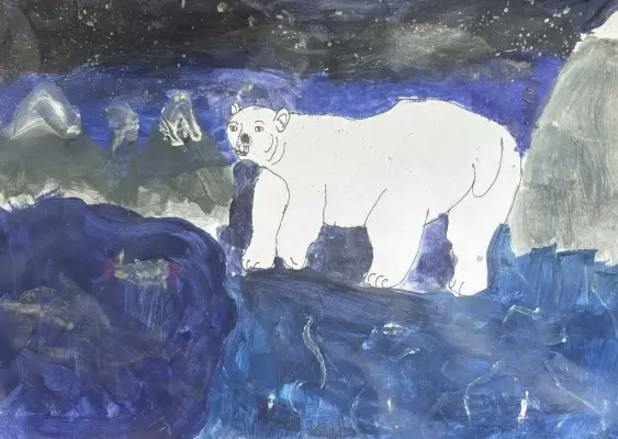Я нарисовала белого медведя на конкурс, так как мне понравилась идея изобразить этого могучего зверя. Моя работа показывает какой медведь большой и смелый, он может легко поймать рыбу. Он изображен на льдине. Если приглядеться, то над ним созвездие Малой медведицы.