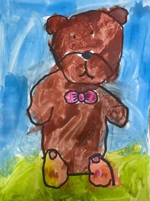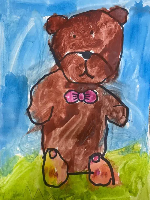 Мы с мамой и папой в прошлом году ездили в Московский зоопарк и я очень была впечатлена силе и красоте медведя. Мы с папой долго стояли у вольера с медведями и я представляла как могла бы поиграть с ним, если бы он был добрым и домашним. И вот я нарисовала картинку на занятиях по рисованию в садике.
