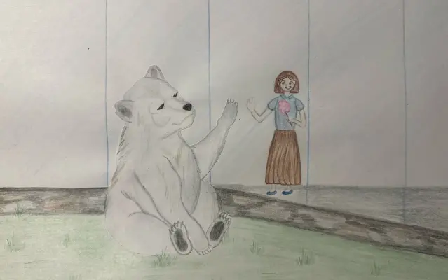 Я с семьёй посещала зоопарк. Прогуливаясь по нему я остановилась у клетки с бурым мишкой. Он мне очень понравился и по этому я решила нарисовать рисунок.