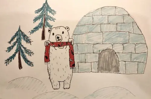 Работа выполнена фломастерами. На ней изображен Мишка на севере, около ледяного дома. Такие дома называются иглу. Их строят эскимосы. Рядом растут маленькие елочки.