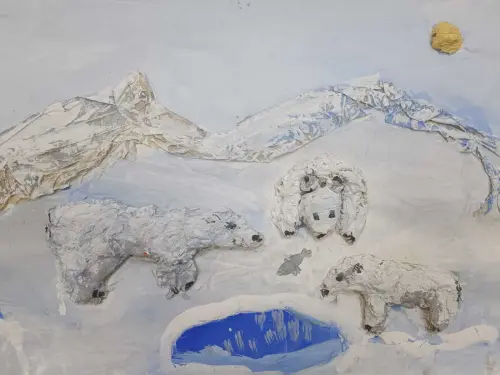На работе изображены белые медведи, которые ловят рыбу. Снежные холмы и холодное северное солнце. В работе использовалась смятая бумага для придания объема.