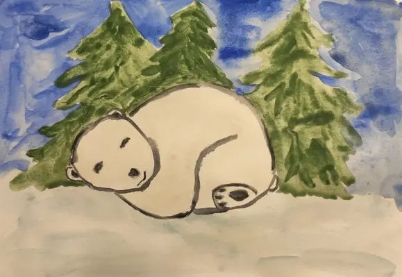 Белые мишки такие милые! Особенно когда спят. Мой мишка спит около трех пушистых елочек. Он наверное видит сладкие сны о вкусной рыбе. Работа нарисована акварелью.