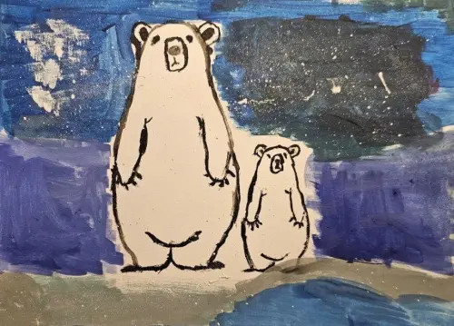 На рисунке я изобразил двух белых медведей. Один побольше, другой поменьше. Вокруг них полярная ночь и метель. Мишки стоят на льдине. Работа нарисована гуашью.