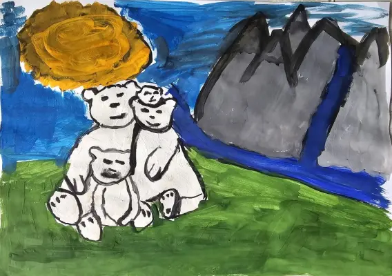 Я нарисовал веселую семью белых мишек. Они обнимаются и улыбаются. На небе яркое солнышко. Рядом горы и река. Мишки сидят на зеленой травке. Работа выполнена гуашью.
