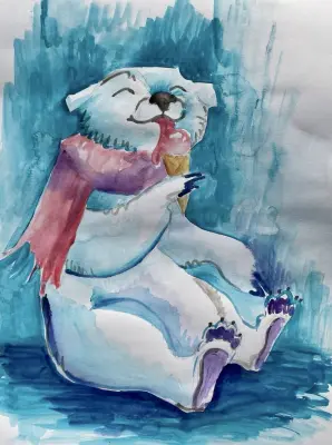 Я нарисовал белого мишку, который облизывает мороженое. Мишка сидит расслабленно, наслаждаясь лакомством. Его шерсть пушистая, а глаза выразительные. Мороженое яркое и аппетитное, с капельками, стекающими по краям.