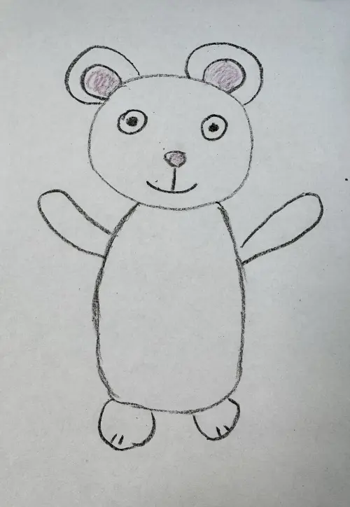 Белый мишка радостно приветствует нас. Он машет своей пушистой лапкой, будто зовет всех поиграть с ним. Он очень веселый, добрый и пушистый. Олечка нарисовала свою плюшевую игрушку.