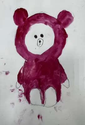 На моем рисунке изображен белый мишка в розовом костюме, моя любимая игрушка! Костюм можно снимать и надевать, мишка очень мягкий. Я всегда беру его с собой в поездки и рада сейчас вам его показать.