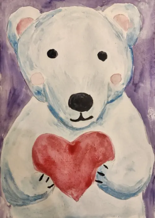 Это мой рисунок белого мишки, которого я нарисовала акварельными красками. У мишки пушистое белое тело и маленькие черные глазки-пуговки. А ещё он держит в лапах красное сердечко, потому что любит всех-всех!