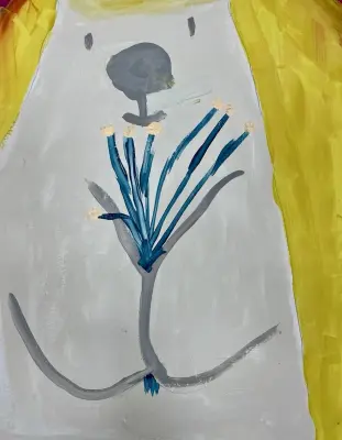 У меня нарисован весёлый мишка, который держит красивый букетик цветов в своих лапках. Букет состоит из ярких цветочков, похожих на первые весенние цветы. Мишка улыбается широкой улыбкой и смотрит прямо на вас, показывая, как он рад весне.