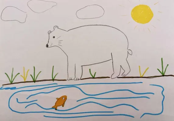 Уже ежегодгая традиция - ходить весной в Московский зоопарк. В этом году больше всех понравились нерпы и медведь Терпей. Провели около белого мишки полчаса, очень интересно было за ним наблюдать не только детям, но и взрослым. На этом рисунке Терпей ловит рыбку.