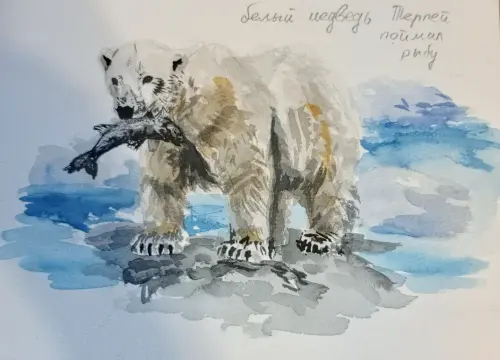 Работа выполнена акварелью. Медведей до этого я не рисовала, поэтому с удовольствием принялась писать Терпея. Мне показалось интересным изобразить белого медведя с большой рыбой. Конечно сначала сложно было намечать карандашом Терпея на листе, а потом ещё покрывать краской так, чтобы он оставался белым. Результат мне очень понравился, и я желаю Терпею счастливой и интересной жизни в нашем зоопарке!