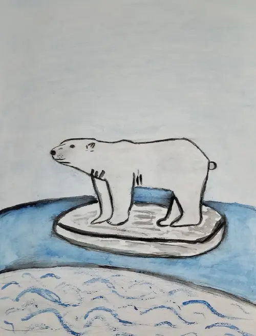 В начале лета я вместе с семьёй посетила Московский зоопарк. Там было очень много разных животных и птиц, но больше всего мне понравилось наблюдать за белым медведем по имени Терпей. Каким же он был забавным! То он лениво перекатывался с боку на бок, то вдруг резко нырял в воду, а потом с шумом выныривал, разбрызгивая воду во все стороны. После посещения зоопарка я решила нарисовать Терпея на льдине, окружённом холодными волнами. Мне хотелось передать его спокойную мощь и в то же время игривый характер. Я добавила в рисунок сверкающие льдины и северное сияние на фоне, чтобы подчеркнуть суровую красоту его родной Арктики.