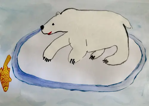 Недавно я была в зоопарке. Увидев белого медведя и представив, как ему у нас жарко в эти летние дни, мне захотелось отправить его туда, где ему будет хорошо-на Северный полюс. Там он будет плавать на льдинах и ловить рыбку, как медвежонок в мультфильме Умка.