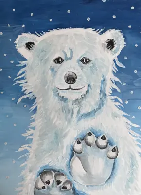 Рисунок изображает белого медведя — величественного представителя северной природы. Его густая белая шерсть подчеркивает силу и красоту животного, приспосабливающегося к экстремальным условиям Арктики. Глаза отражают мудрость и спокойствие дикого зверя. Белый медведь, приветливо машет лапой. Это забавная и трогательная сцена, передающая дружелюбие и открытость. Образ напоминает нам о необходимости бережного отношения к животным.