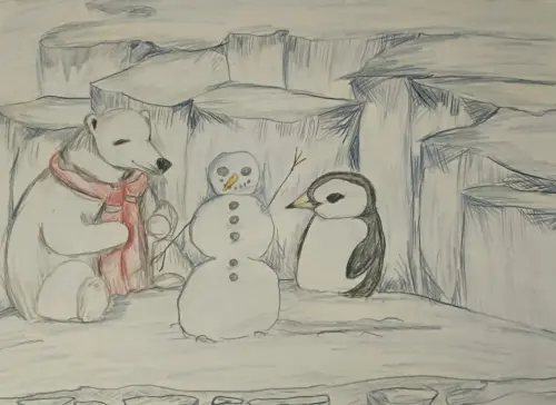 Медведь Терпей очень любит зиму, он любит проводить время с друзьями и лепить снеговика. Пингвин его самый лучший друг. Работа нарисована карандашами.