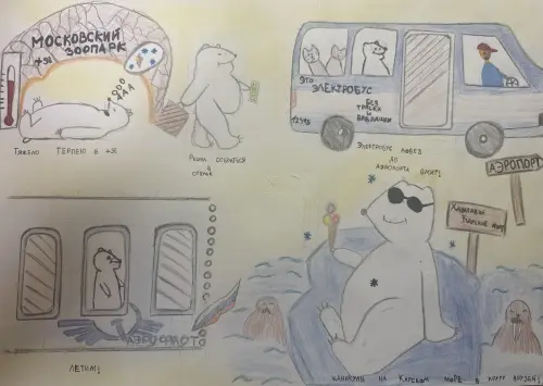 Этим летом медведю Терпею было очень жарко в Московском зоопарке. На улице стояла жаркая погода +36. Он решил собраться в отпуск . Купив билеты, медведь отправился к электробусу, который вмиг довез его до аэропорта . Пару часов полета на самолете и медведь уже в кругу друзей на Карском море. Ура отпуск!