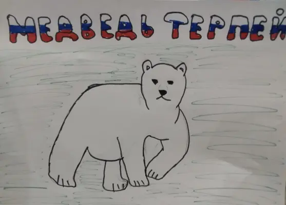 Мой рисунок - это про смелого мишку Терпея, медведь сам по себе крепкий большой и может защитить себя. А еще мы его видели в зоопарке, он катается на снегу играет с мячом.