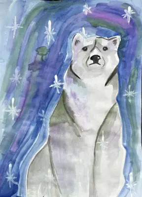Работа выполнена акварелью на формате А3. На рисунке Белый серверный медведь на фоне северного сияния смотрит задумчиво вдаль, словно размышляя о тайнах виртуальных миров и безопасности данных. Его глаза отражают мерцание зелёных сполохов, подчёркивая загадочность и мощь природы высоких широт.