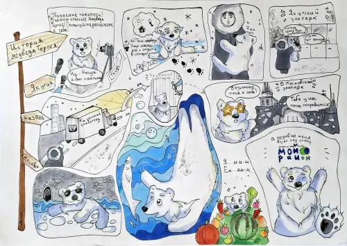 Я нарисовала комикс с биографией белого медведя Терпея. В комиксе медведь даёт интервью журналистам и рассказывает о своей длинной и непростой жизни. О том, как он остался медвежонком без мамы, был спасён якутскими жителями, сменил несколько зоопарков... И наконец попал в Московский! В Московском зоопарке у Терпея появился просторный вольер с бассейном, где он охотится на рыбок, а после плаванья кушает фрукты и овощи:)