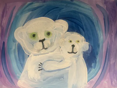 Эта работа нарисована после просмотра мультфильма «Умка». Белая медведица - сильная, могучая, яростная и в то же время очень заботливая по отношению к своим медвежатам.