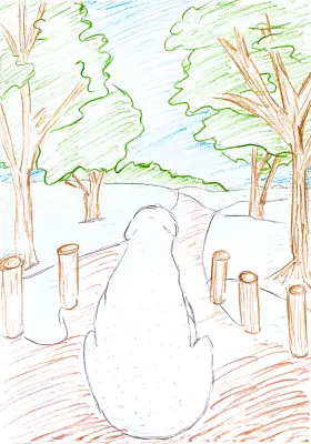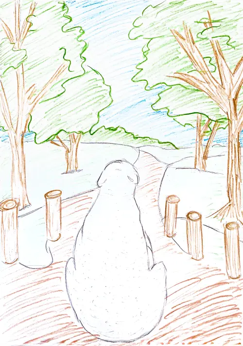 В зоопарке был выходной, и красивый белый мишка Терпей решил прогуляться по городу, в котором он живет. Терпей сел на метро и доехал до Кузьминок. Это было несложно, ведь Баррикадная и Кузьминки находятся на одной линии метро. Оказавшись в парке, он замер от восхищения, ведь природа Кузьминок по-настоящему уникальна! За созерцанием природы я и застала мишку и решила его нарисовать.
