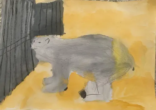 Я, когда была в зоопарке, заметила этого Мишку и захотела его нарисовать. Это был славный белый медведь Терпей, который ходил по своему вольеру. Медведи очень замечательные, они так забавно ходят!