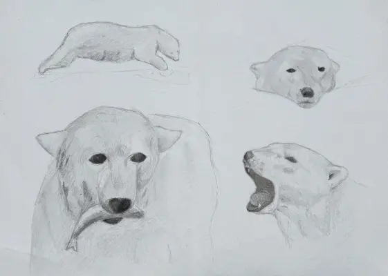 Несколько набросков белого медведя Терпея на листе А3, выполненных простым карандашом. Работа отображает характер и всю красоту белого медведя.