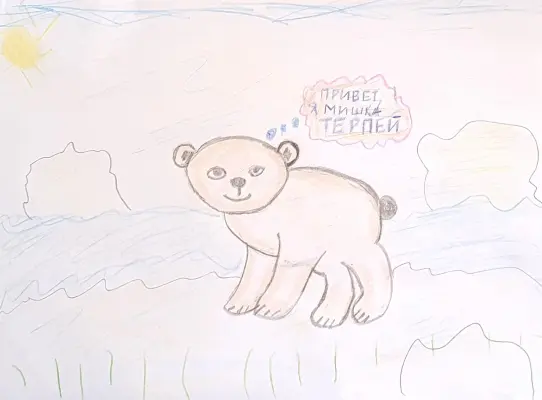 Одно из любимых мест посещения нашей семьи - зоопарк. Я очень люблю наблюдать за животными. Мишка Терпей - мой любимец. Поэтому я решила принять участие именно в этом конкурсе и нарисовать своего белого мишку, который ищет свою маму, мечтает обрести свою семью. Яркое солнышко помогает найти ему верный путь.