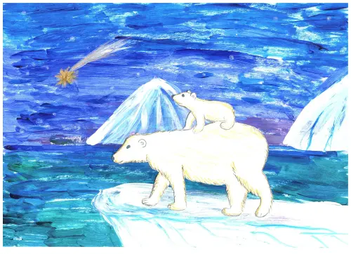 Я нарисовала малыша Терпея в детстве. Он сидит на спине папы и наблюдает, как падает звезда. Я думаю, что он загадывает желание. Он мечтает стать таким же большим, сильным и смелым медведем, как его папа.