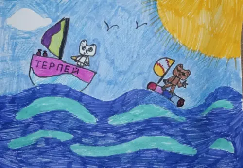 Однажды мишка Терпей ждал своего давнего друга в гости. Он должен был приплыть к нему в среду, но был уже четверг, а друг до сих пор не приехал. Мишка Терпей созвонился с другом и узнал, что у того сломался винт на лодке. Тогда наш отважный и смелый медвежонок решил спасти своего друга и отправился к нему на помощь. Он взял с собой необходимые для ремонта инструменты и наловил свежей рыбы, чтобы накормить друга. Терпей доплыл до друга за 5 часов. Друг Терпея был очень рад встрече. Терпей накормил друга рыбкой, а пока тот лакомился угощением, он отремонтировал его лодку. А потом они вместе отправились дальше по морским волнам к домику Терпея.