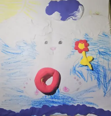 Рисунок нарисован с помощью восковых мелков и мягкого пластилина. Медвежонок приехал в гости на Северный полис с подарками для мамы. С цветочком и пончиком.