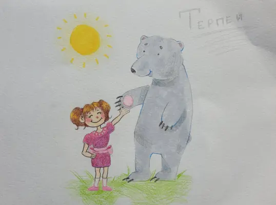 Это мишка белый Терпей. Он прогуливается с моей сестрёнка Кирой! Он такой нежный и ласковый. На улице замечательная летняя погода, светит солнышко. И Кирочка довольная прогулкой с Терпеем!