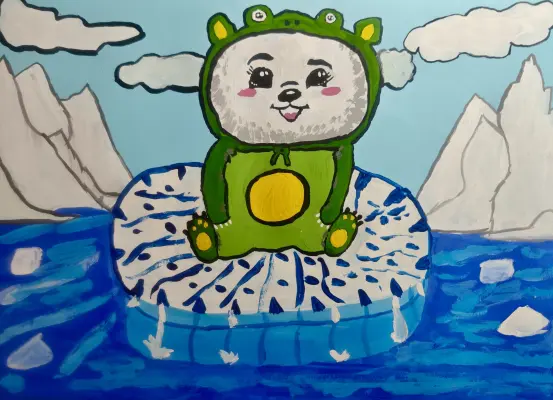 Медвежонок Терпей в костюме лягушки, плывёт на айсберге на свою родину. Он катается по Атлантическому океану. Ему очень тепло и хорошо. И он плявет на айсберге к своей мечте. И он очень любит путешествовать.