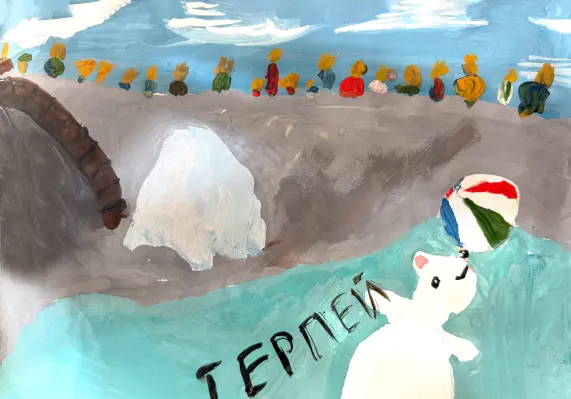 Медвежонок Терпей в жаркий день играет с мячом у себя в бассейне. На заднем плане много людей наблюдают за ним. Рядом находится гора из искусственного снега, чтобы мишка мог охладиться и пещера, в которой он может отдохнуть в тихий час и когда устал от зрителей.