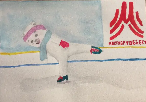 Тарпей - белый медведь. Он любит холод. Тарпей искал себе холодное место, долго искал его и нашел мой каток, где я тренируюсь. Тарпею стало интересно катается на коньках, и теперь он катается со мной! Рисунок выполнен акварелью и карандашом.