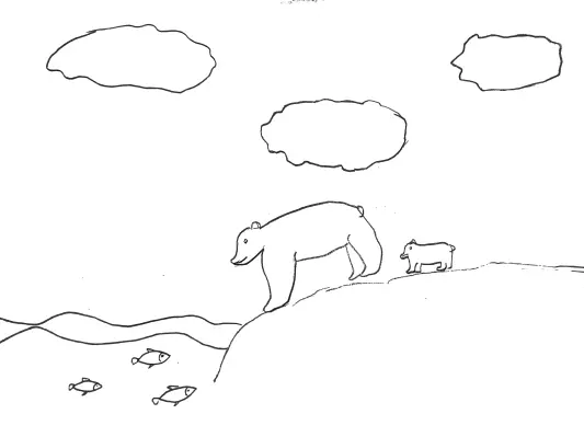 Медведица повела своего белого медвежонка к водоему, учить ловить рыбку. Белый медвежонок очень любознательный, но аккуратный. Стоит за мамой, ведь нельзя знать, что на уме у рыбы, он с ними еще не знаком.