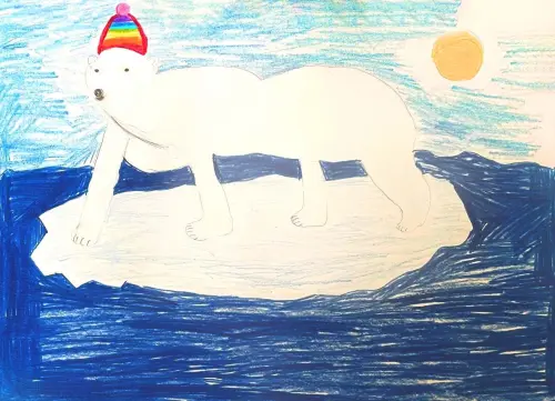 Медведь плывет на льдине по Северному Ледовитому океану в разноцветной шапке. Вокруг голубое небо и светит солнце. У него на голове разноцветная шапка, потому что он очень любит радугу и хочет, чтобы Новый Год прошел отлично и весело!