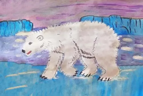 Я захотел его нарисовать, потому что белый медведь занесен в красную книгу. Это очень редкие, большие и красивые животные. Он сильный, любит ловить и есть рыбу.