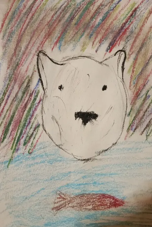 На моей картине изображён белый Мишка, заставший северное сияние вдали от дома, где-то на Северном полюсе, но ему повезло, он поймал рыбку себе на ужин.
