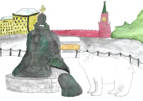 Я нарисовала белого медведя Терпея в Кремле у Царь-колокола. Мне кажется, ему бы очень понравилась Москва и её достопримечательности. Особенно летом очень красиво!
